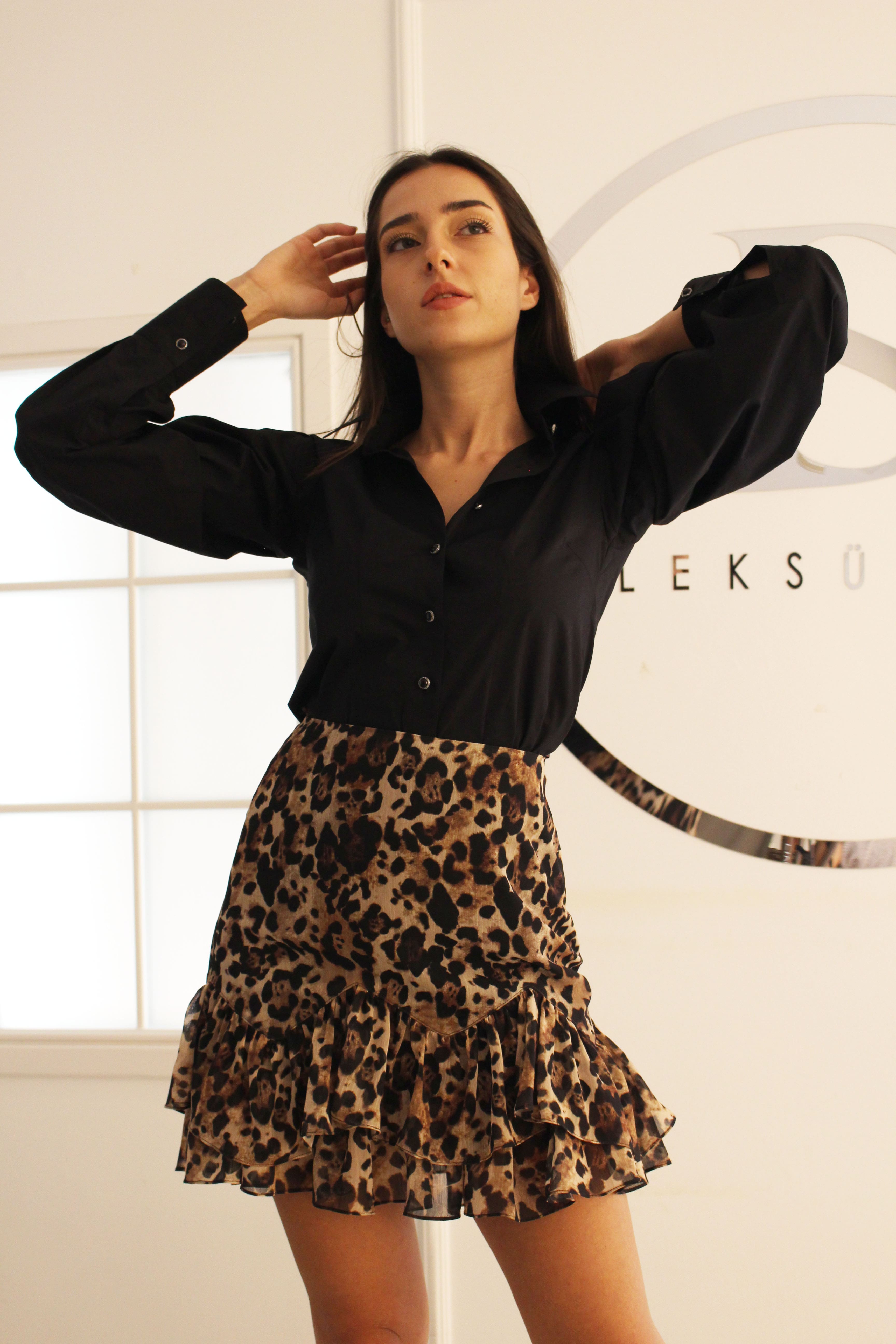 Kahve Leopar Desenli Kısa Etek