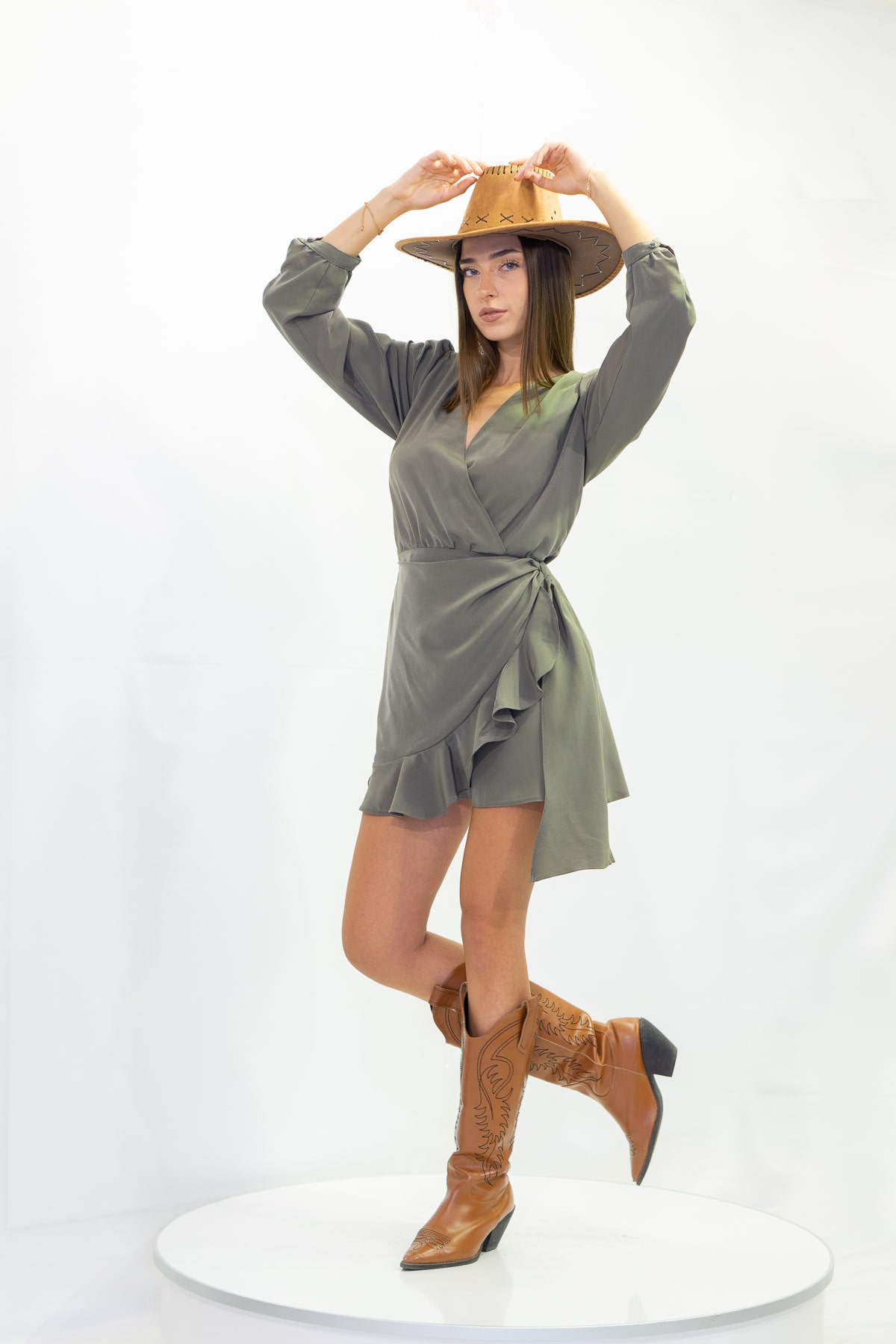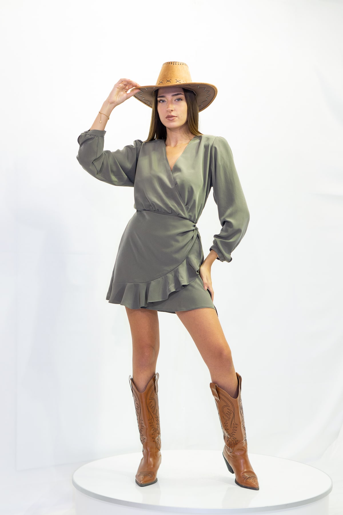 Gri renk, etek kısmı fırfır detaylı elbise